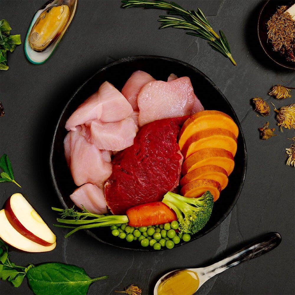 Freshly Prepared Free-Run Chicken (35%), Freshly Prepared Beef (30%), Sweet Potato, Carrots, Peas, Broccoli, Minerals, Green Lipped Mussel*, Salmon Oil, Apple, Spinach, Seaweed, Parsley, Yucca, Rosehips, Nettle, Marigold, Slippery Elm, Aniseed, Peppermint, Rosemary. *Source of Glucosamine (100 mg/kg).