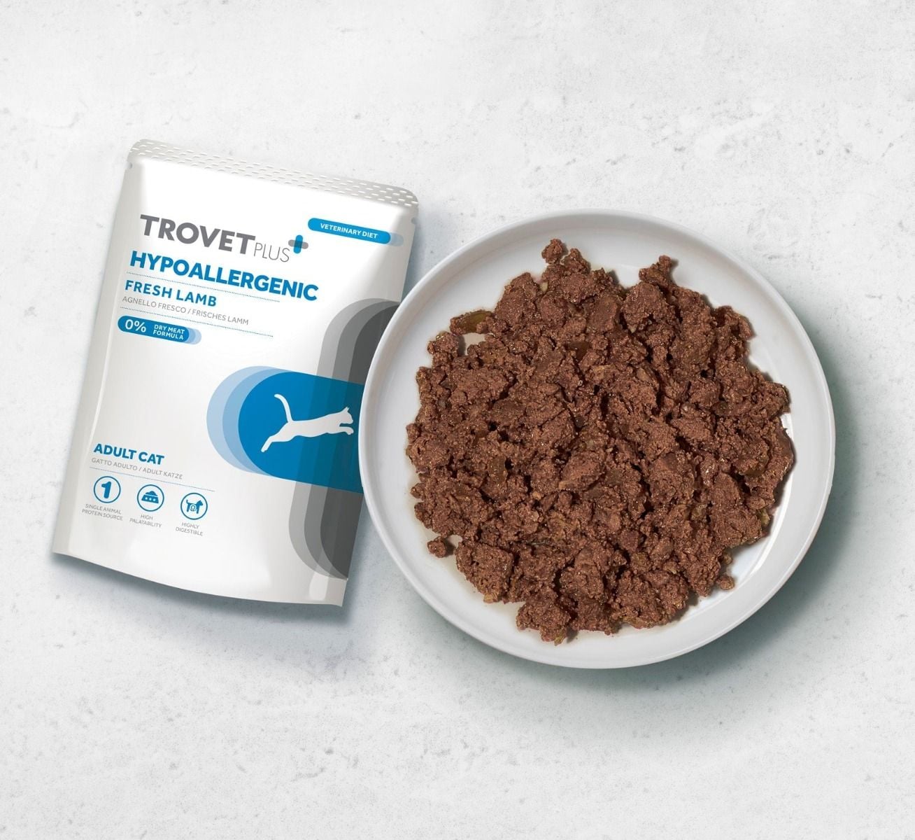 Trovet Plus Hypoallergenic Fresh Lamb Veterinary Diet is a complete wet food formulated for adult cats with food intolerances or ingredient sensitivities. Food-related sensitivities can lead to digestive discomfort, skin issues, and reduced overall wellbeing. This veterinary diet is designed to help manage these challenges while providing balanced, everyday nutrition.
