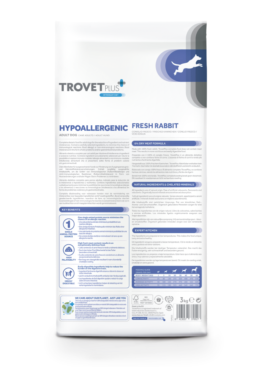 Trovet Plus Hypoallergenic Fresh Rabbit Veterinary Diet Adult Dog Dry Food is a complete and balanced veterinary diet formulated to support adult dogs with food allergies or intolerances. Using rabbit as a single novel animal protein source, this diet helps reduce the risk of adverse food reactions while providing full daily nutritional support.
